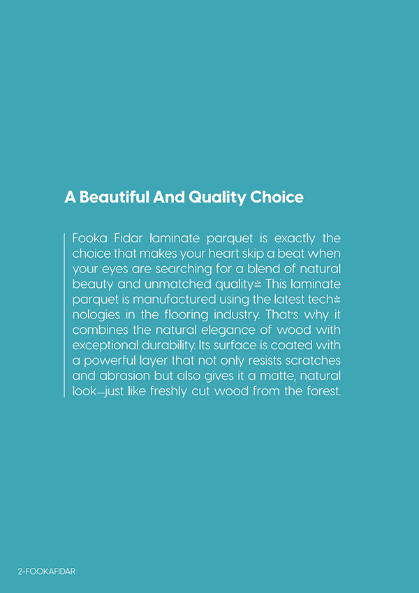 این برند به خوبی میداند که پارکت لمینت فقط یک پوشش کف نیست، بلکه جلوهای از هنر و مهندسی است که باید هم زیبا باشد، هم بادوام و هم پاسخگوی شرایط خاص آب و هوایی و سلیقه ما ایرانیان. فوکا فیدار یک پارکت ارزان ایرانی است که از نظر کیفیت و زیبایی، چیزی از برندهای خارجی کم ندارد. فوکا فیدار با شعار “ایرانی بمان، جهانی بیندیش” پارکتهایی تولید میکند که از نظر فناوری ساخت، تنوع طرح و کیفیت مواد اولیه، رقیبی جدی برای برندهای خارجی به شمار میرود.