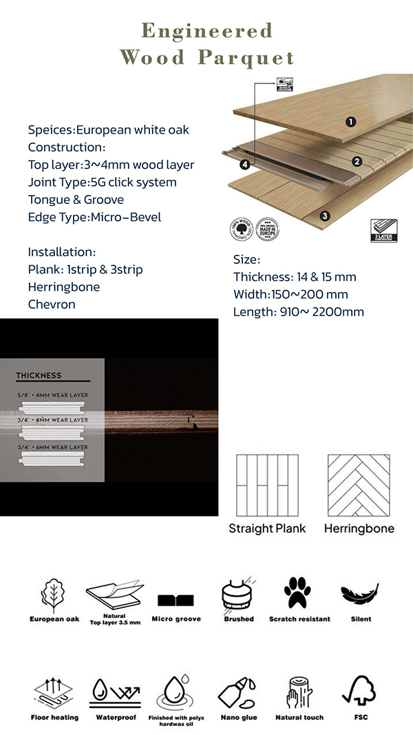 کارخانه پارکت چوب لیاهوم LIYA HOME، این محصول را از چندین لایه مختلف تولید کرده است. لایههایی که از ورقهای نازک چوب طبیعیِ سخت مانند افرا، بلوط، توس یا گردو ساخته شدهاند. این ورقها لایهبهلایه و به صورت عمود بر یکدیگر چیده میشوند تا تنشها را پخش کرده و از خم شدن یا ترک خوردن پارکت جلوگیری کنند.